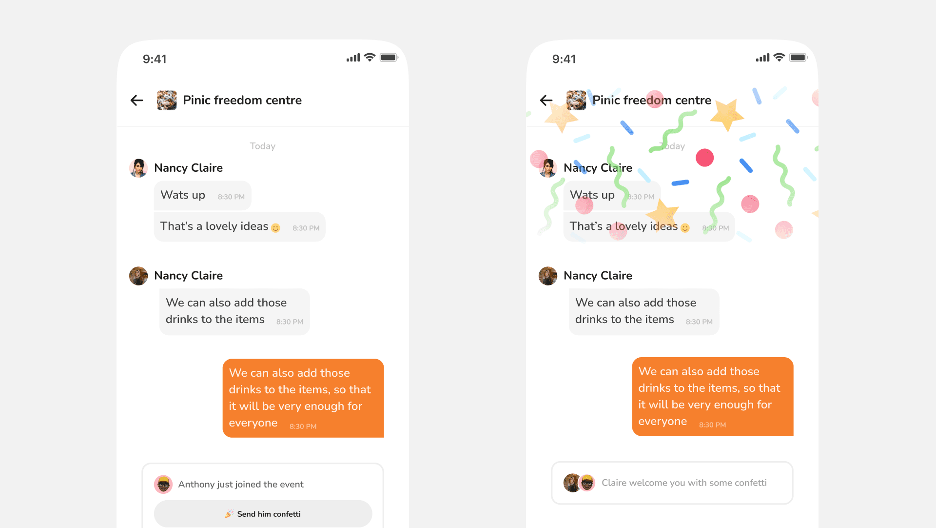 One of the core deep delights in terms of self motivation is “relatedness” for users. This help users to have a better sense of belongingness. When a new member join the event chat group, older participants can send a welcome confetti to welcome them.