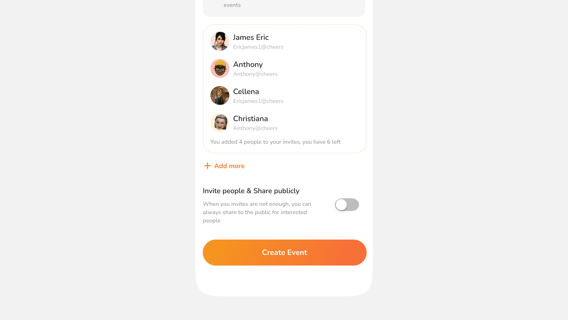 To make the process seamless and straightforward, when the host has set attendee number to a certain figure let’s say 10 people, and the host choose to invite people directly, if the host tag only 6 out of 10 people, the system automatically will prompt a button to share to public as well so that the numbers of users they needed for the event can complete. This is very useful when people want to organize quick event like street soccer, and you need people to join in the event, you already have some people but need more people, just invite the people you know and share publicly.