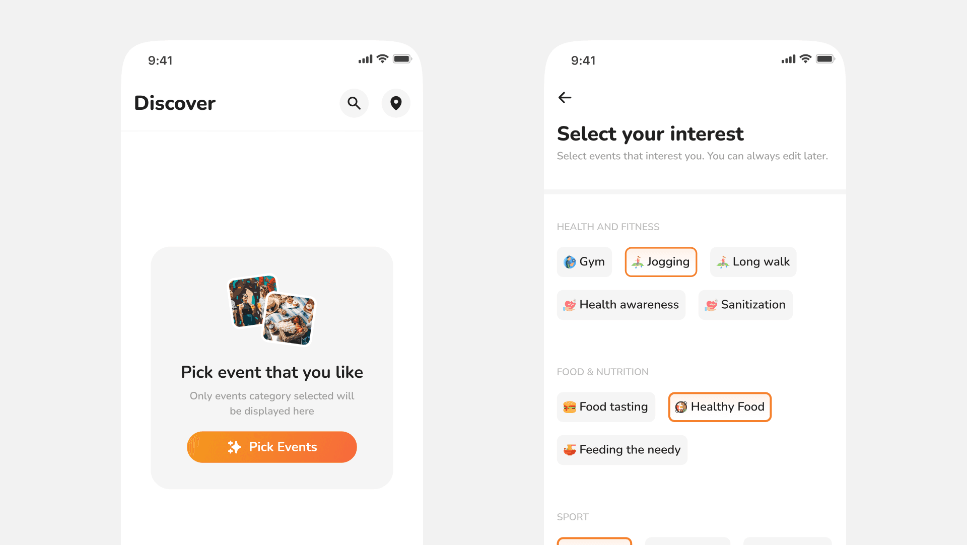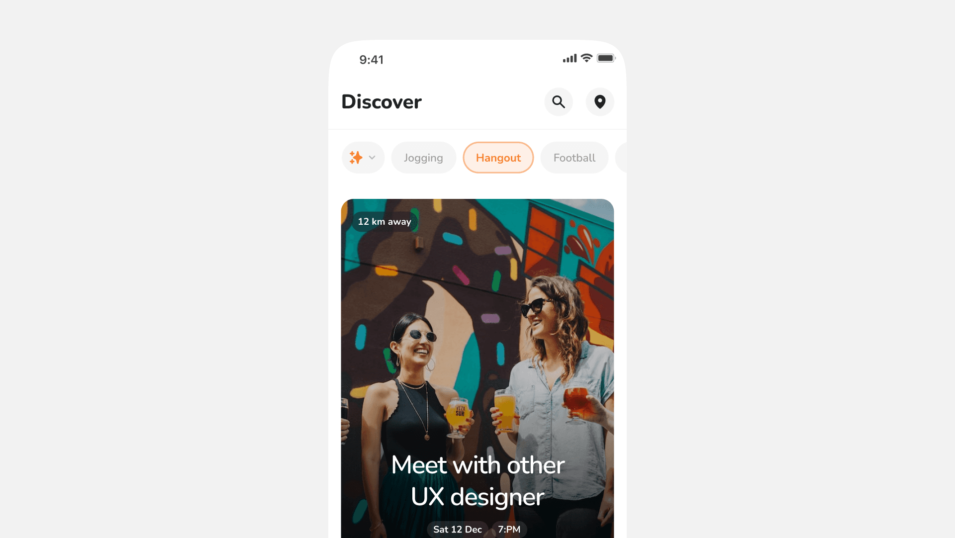 Once user are onboarded, they are taken directly to discover section. At first, the page is blank, every users will have to set the type of event they want to see on their timeline.