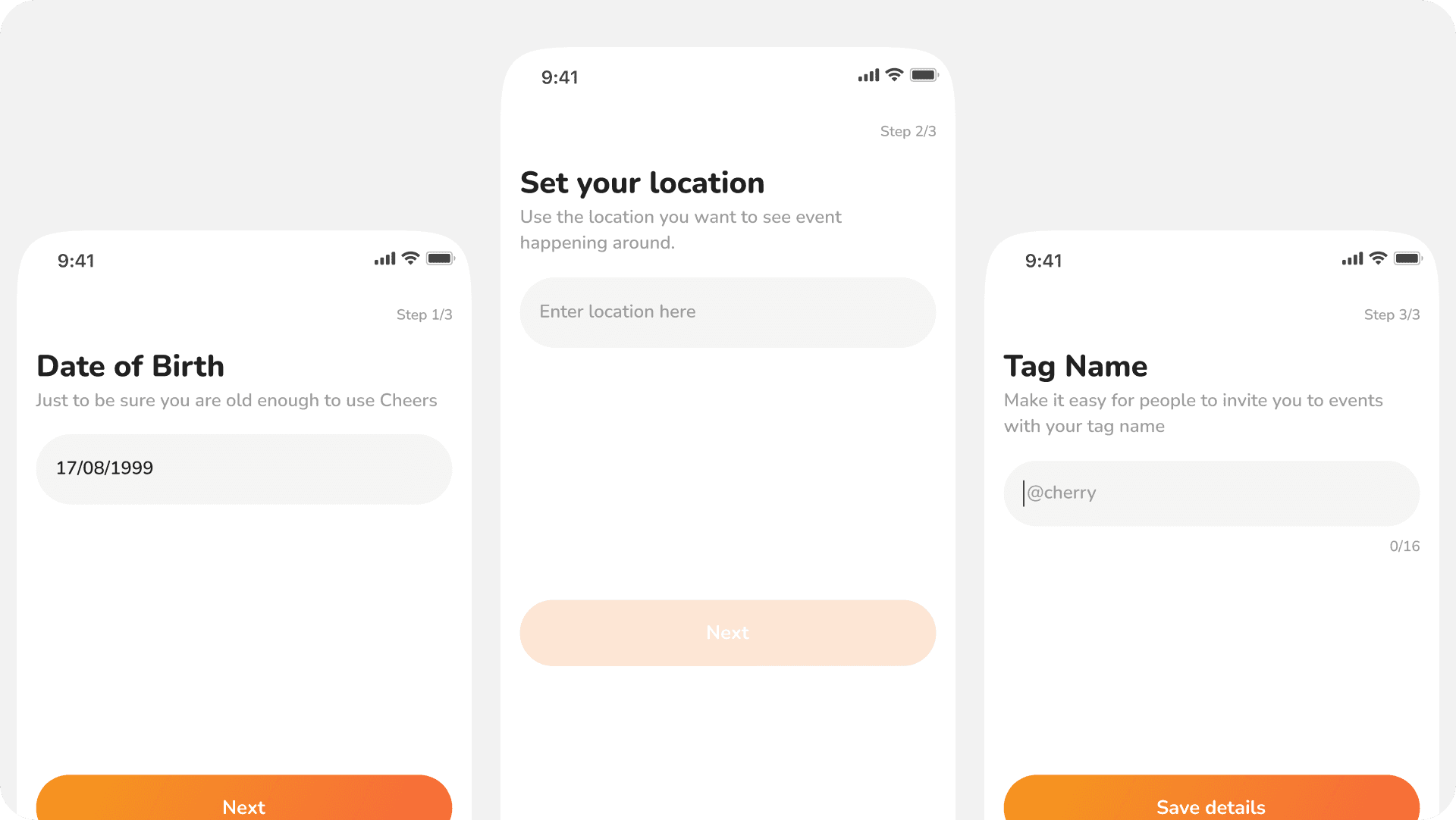 After using google account or email to create account, users will be onboarded immediately under 3 steps. The details ask will help them to easily find events and allow people invite them to events perfect for them.