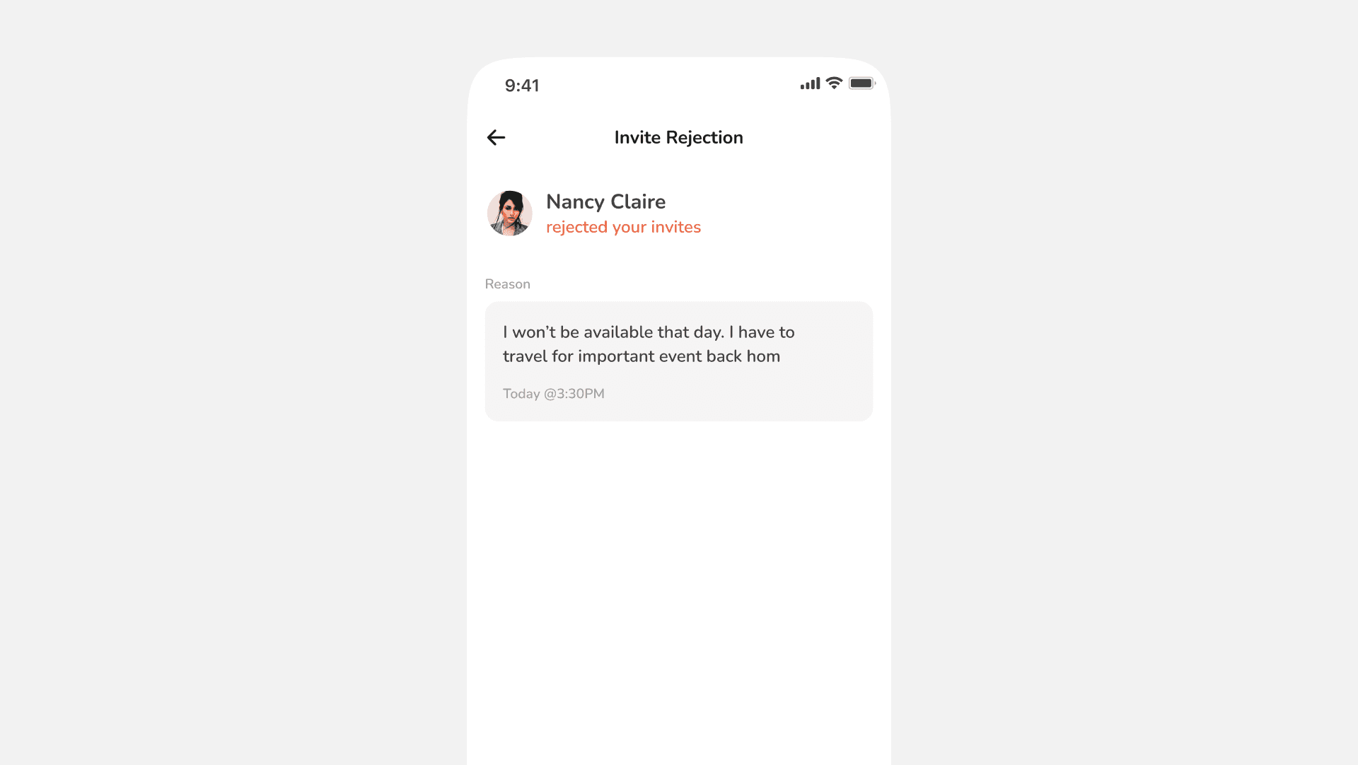 Users can either accept or reject any event they are tagged to. Reason for rejection are stated as well.