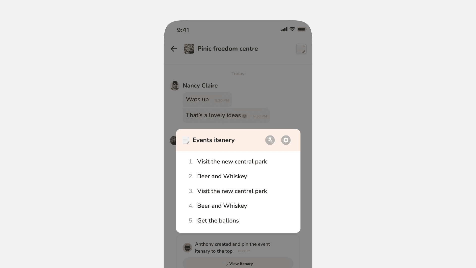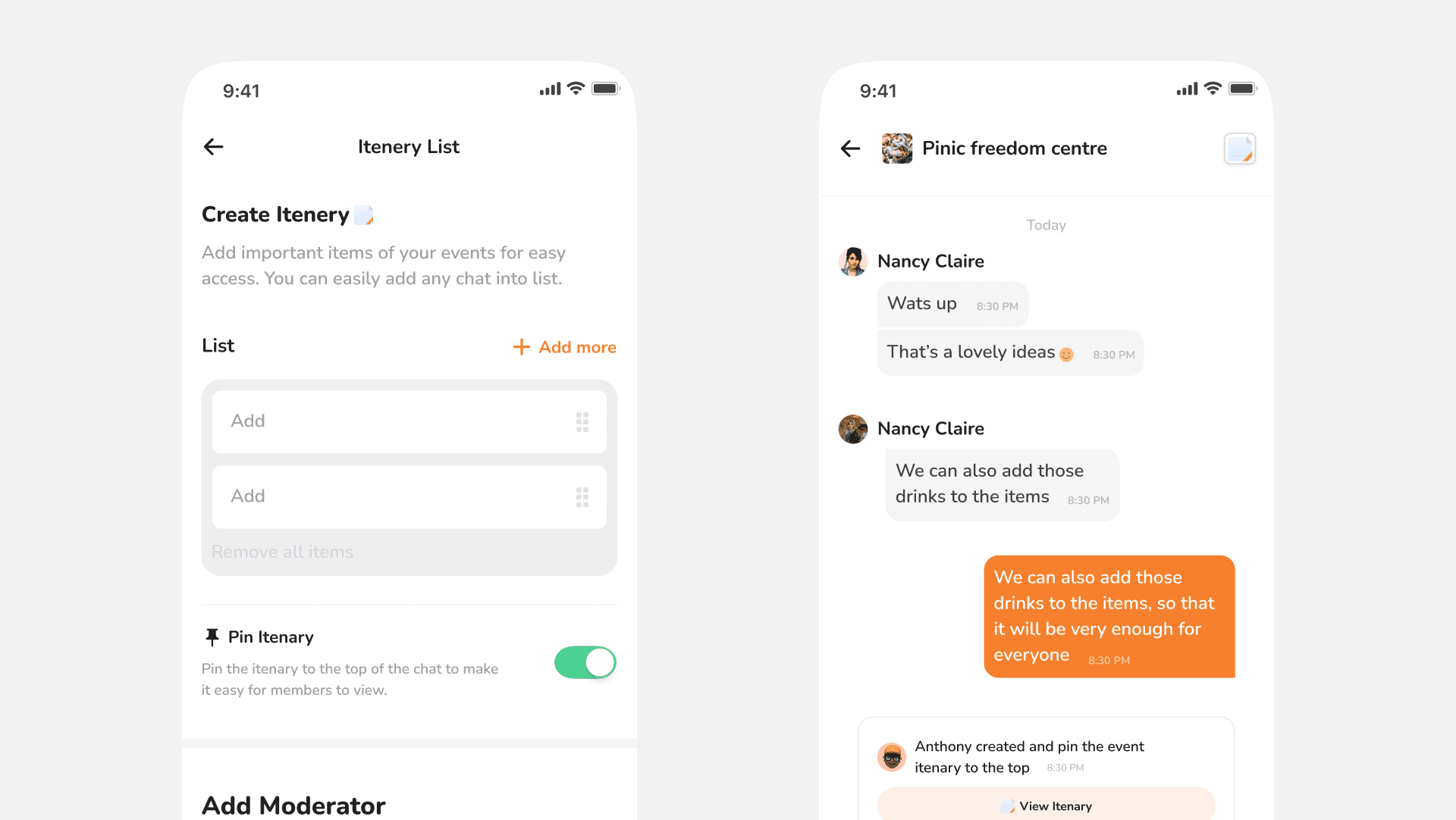To make this more accessible, once created the Itinerary sticks to the top to anyone can easily retrieve information from there. In summary, say no to arguing over what items is needed for an event because it will be on the itinerary.