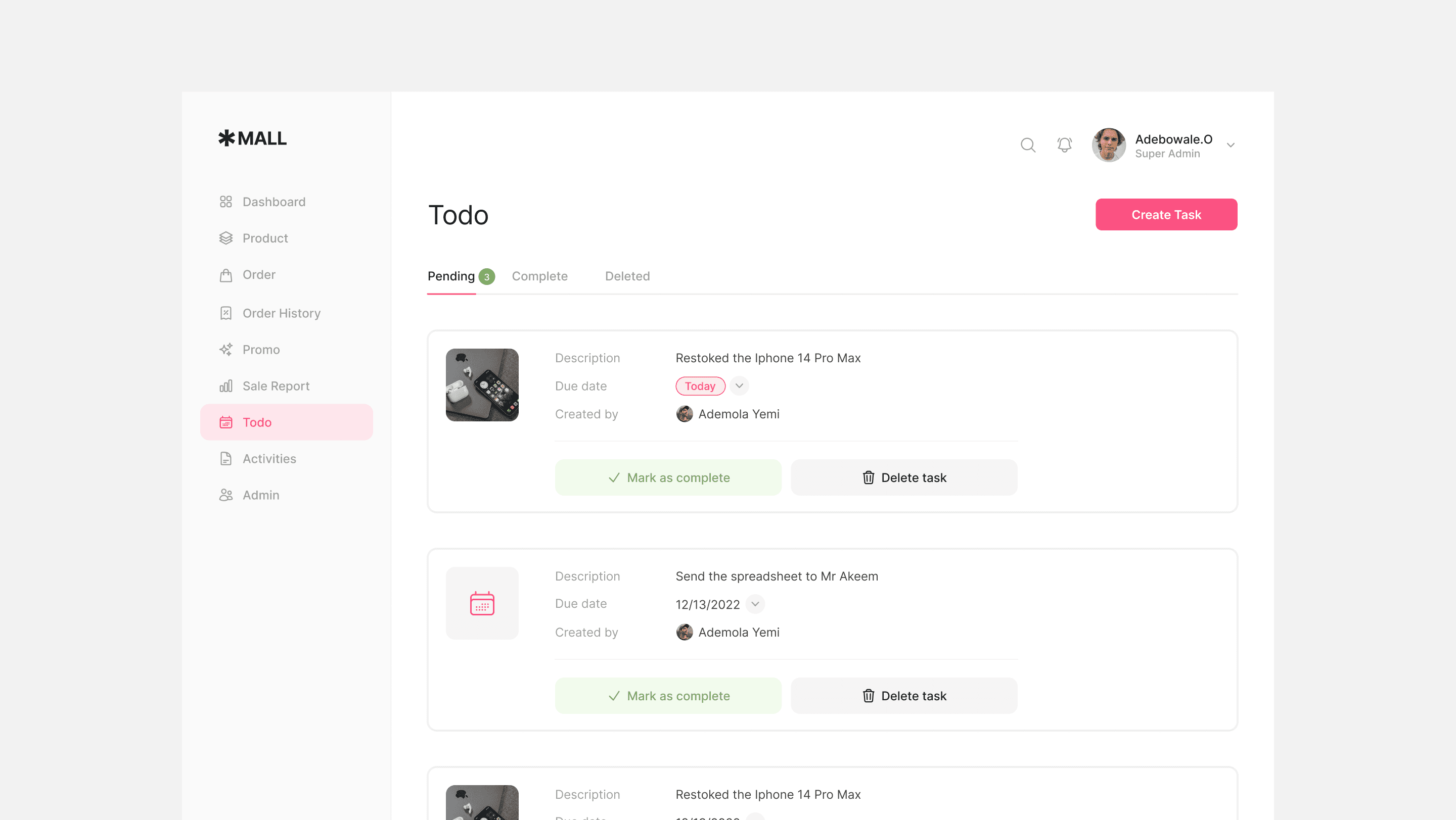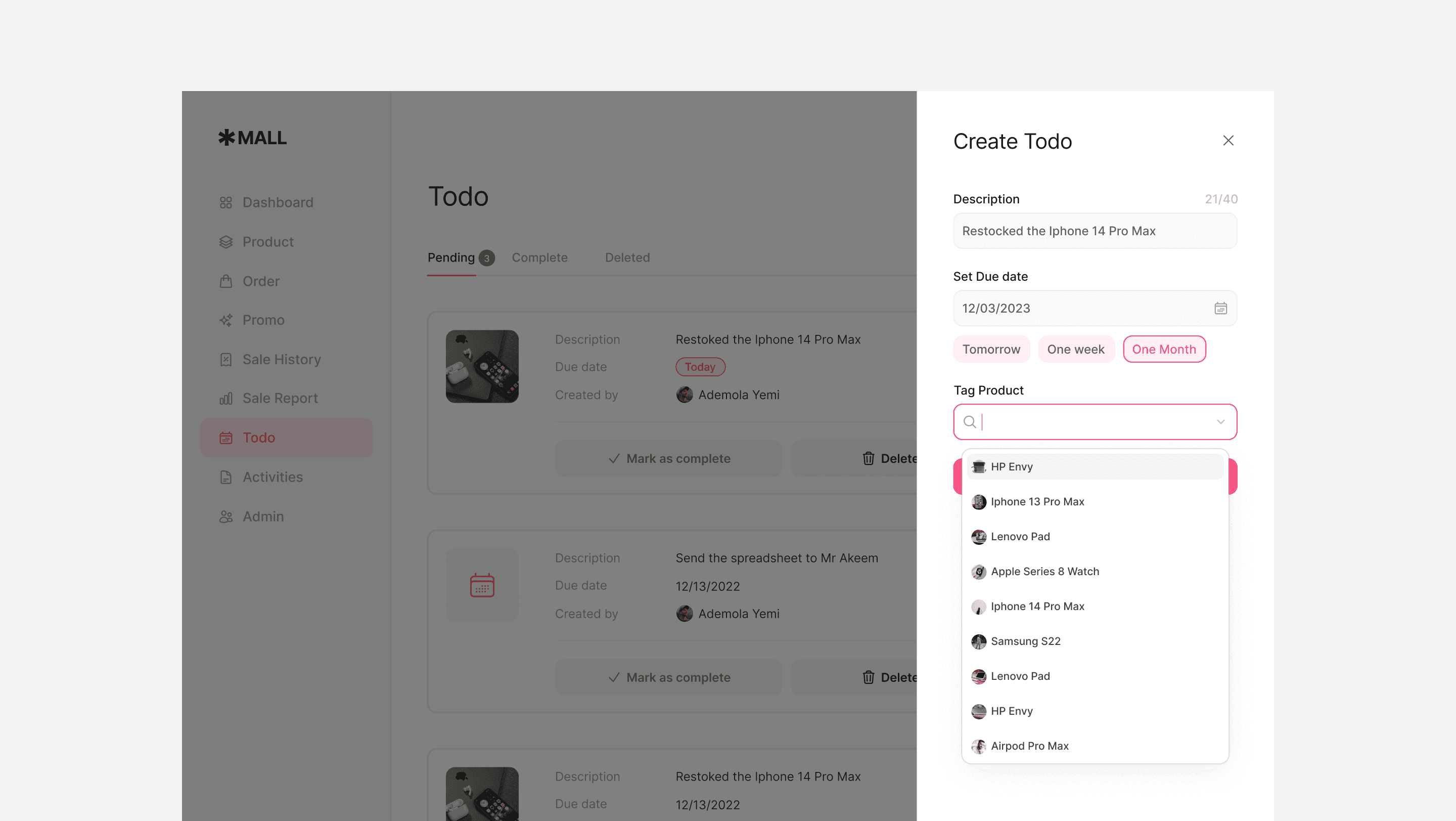 Store merchant or keepers can easily create to-do tasks, set date and time and get notified when due. Through notifications store keepers can easily set restocked date and this will automatically be added to their to-do list. They can also manually create todo list for any product or action.
